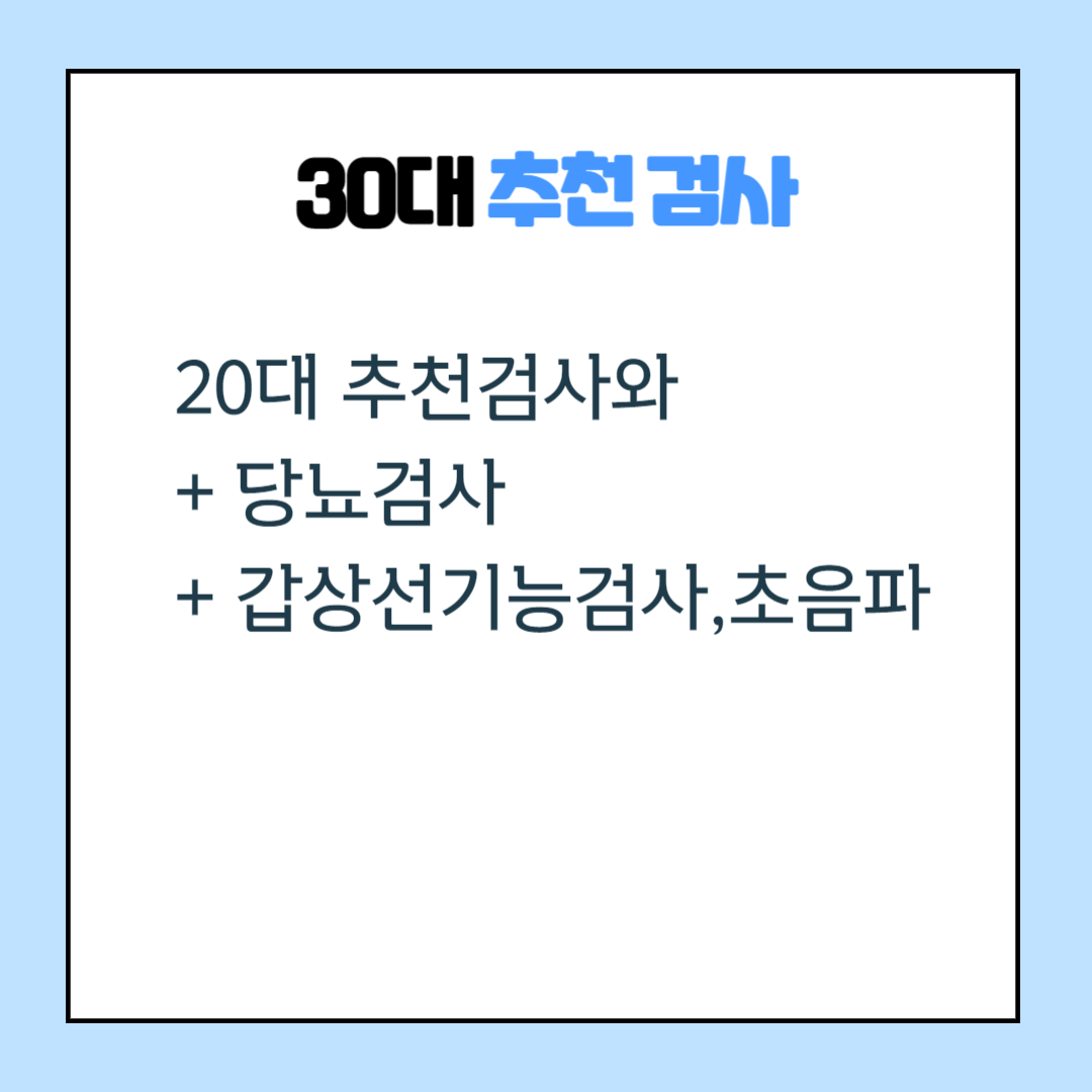 30대에서는 만성 질병 위험이 증가하기 시작하므로 이러한 질병을 조기에 발견하고 예방하기 위해 당뇨 검사, 갑상선 기능 검사(혈액검사,초음파) 를 추가한 검진이 추천됩니다. 주기는 일반적으로 2-3년 마다 받는 것을 권장합니다.